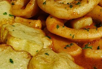 1- Cortar los calamares o potas en trozos o anillas, lavar , secar bien con papel de cocina y reservar.