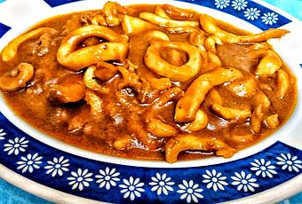 Cortamos las cebollas en trocitos muy pequeños y la ponemos a pochar en una cacerola con aceite de oliva, añadimos los ajos en laminas y dejamos hasta que comienza a ponerse transparente, agregamos el tomate triturado el azúcar y la misma cantidad de sal que de azúcar y dejamos cocinar durante 10 minutos, pasado el tiempo añadimos la pastilla de caldo, los calamares y un pellizco de pimienta y dejamos cocinar durante 15 minutos.