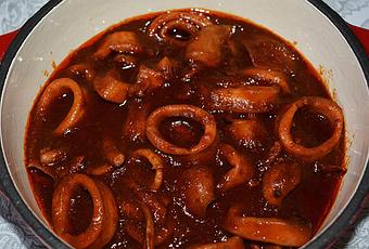 Cocinamos a fuego lento hasta que los calamares estén tiernos. Podemos espesar la salsa con un poco de maicena.