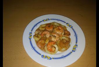 Bajamos el fuego y dejamos durante 25 minutos o hasta que los calamares estén tierno, añadimos el perejil bien picados y los langostinos, dejamos otro par de minutos o hasta que los langostinos adquieran un color rosado y ya están listos para sacarlos.