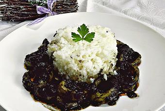 Finalmente añadimos el vino blanco, una cucharada de maizena, tinta de calamar y una pizca de pimienta y dejamos cocinar unos 25-30 minutos a fuego medio hasta que los calamares estén tiernos a fuego medio removiendo de vez en cuando para que no se pegue.