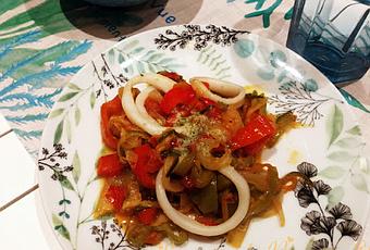 La receta en concreto de estos calamares en wok con pisto fue un amor a primera vista que me encontré ojeando una revista y que intuyo que la autora de la misma es nuestra amiga Concha de " Cocina y Aficiones". He utilizado más cantidad de hortalizas de las que vienen en la receta, pero podéis ponerlas según vuestros gustos.