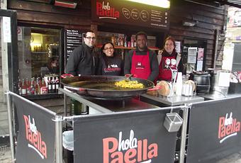 El staff de Hola Paella inicia su día cocinando esta enorme paella y a las 11 am comienzan a llegar personas de todo Londres buscando la mejor opción para su almuerzo. Los visitantes podrán escoger entre 3 tamaños disponibles de platos y acompañar su bebida con un zumo, cerveza española, vinos o gaseosas. Puedes pasar y comprar tu paella para llevarla a casa, comerla de camino o quedarte dentro de su acogedor restaurante y disfrutarla allí.