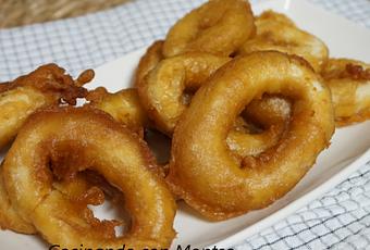 Ponemos una sartén alta con abundante aceite de oliva, ha de estar bien caliente pero que no llegue a echar humo, la temperatura máxima a de ser de 180º. Vamos añadiendo los aros de calamar en la masa en tandas.