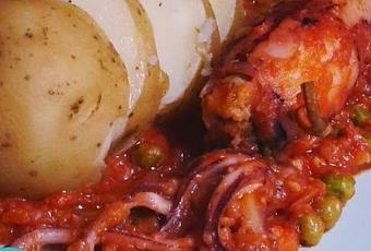 INGREDIENTES1 KILO DE CALAMARES.1/2 CEBOLLA.1 VASO DE VINO BLANCO.2 HUEVOS COCIDOS.50 GR DE AVELLANAS.50 GR DE PASAS SIN SEMILLAS.ACEITE DE OLIVA VIRGEN.HARINA.2 PATATAS COCIDAS.300 ML DE SALSA DE TOMATE.50 GR DE MIGAS DE PAN.SAL Y PIMIENTA.1 HOJA DE LAUREL.TOMILLO.1 DIENTE DE AJO.100 GR DE GUISANTES.REALIZACIÓN1. Limpiamos bien los calamares, separando los tenáculos, quitándoles la pluma del interior y lavándolos bien. Lo secamos. Mientras tanto ponemos a cocer las patatas en agua y sal 25 o 30 minutos.2.- Preparamos el rellenos. Trituramos los huevos cocidos con los frutos secos, las migas de pan, un poco de cebolla picada y el ajo. Añadimos a la mezcla una cucharada de vino y salpimentamos. Rellenamos los calamares. Los cerramos con un palillo, pasamos por harina y freímos los calamares y los tenáculos, unos minutos.3.- Los sacamos y reservamos. Ponemos a cocer los guisantes en agua y sal con una hoja de laurel. Cuando estén tiernos, los escurrimos. En una olla ponemos la salsa de tomate añadimos los guisantes y el vino blanco. Llevamos a ebullición y dejamos reducir. Incorporamos los calamares y cocinamos a fuego suave hasta que estén tiernos.4.- Repartimos los calamares y platos y servimos con la patata cocida y cortada en rodajas.