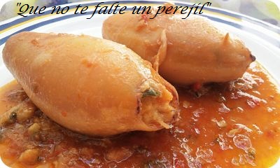 Pela las gambas y reserva. Cuece las cáscaras y cabezas de las gambas. para ello ponlas en un recipiente apto para microondas, cubre de agua e introduce en el micro a máxima potencia durante 10 minutos. Saca y cuela el caldo. Reserva. Sólo utilizaremos unos 100 g. el resto se puede congelar y utilizar en arroces o caldos de pescados, sopas... Reserva.Limpia bien los calamares por dentro y por fuera ( siento no haber hecho fotos explicando como se hace ) . también puedes pedirlo a tu pescadero y te ahorras bastante trabajo. Quita las patitas de los calamares y reserva.Pica con un cuchillo las patitas de los calamares, las gambas, perejil fresco , los huevos duros, añade la miga de pan, sal y pimienta al gusto. Remueve para que quede todo integrado.
