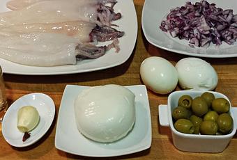 CALAMARES RELLENOS CON SALSA CREMOSA DE CEBOLLETAS AL CAVAPara 2 personas:4 calamares frescos; 1 mozzarella; 2 huevos cocidos; 1 cebolla morada pequeña; 1 diente de ajo; 1 botecito de aceitunas verdes sin hueso; 1 lata de ventresca de atún en aceite de oliva; 1 cayena; 1/2 vaso de vino blanco; aceite de oliva; sal; perejil fresco.Para la salsa: 4 cebolletas; 1 vaso de cava; leche evaporada; pimienta blanca; sal.