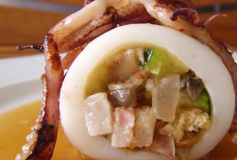 Rellenar los cuerpos de los calamares con el salteado. Colocar los calamares rellenos en una bandeja apta para horno, rociarlos con aceite y vermut blanco seco (o jerez seco) y terminar la cocción en el horno precalentado a 200 grados durante 5 minutos.