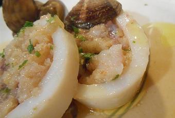 Filetear el calamar y emplatar con la guarnición de almejas y un poco de aceite en crudo.