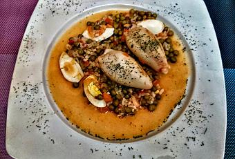 Cortamos las verduras en trocitos muy pequeños y los ponemos a pochar en una sartén con aceite de oliva a fuego lento , empezando con la cebolla , después los pimientos y por último el tomate con una pizca de sal y azúcar para quitarle la acidez , lo dejaremos pochar durante unos 30 minutos , pasado ese tiempo añadimos los trocitos de tentáculos y dejamos cocinar durante otros 10 minutos , también añadimos los trocitos de gambon y dejamos unos 5 minutos , retiramos el sofrito y dejamos enfriar.