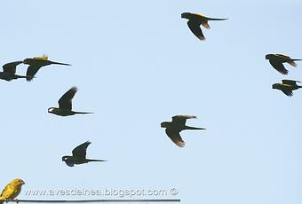 Durante estos dos últimos meses tuve mas tiempo libre de lo habitual y pude observar prácticamente todos los días sobrevuelos de estos loros en las cercanías del barrio, me llevó mas tiempo de lo habitual obtener algunas fotos porque en muchas oportunidades ellos pasaban muy lejos o bien me encontraba sin la cámara, otras veces el contraluz me hacía imposible obtener fotos decentes, pero hoy tuve mas suerte que las veces anteriores y pude fotografiar a una bandada sobrevolando el patio. Ya los había visto en horas de la mañana volando a buena distancia y si bien a las 3 de la tarde pasaron bien en la vertical de casa, la luz del sol no estaba a mi espalda.