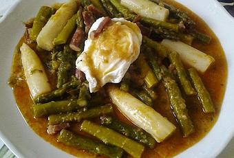 Cuando falten 5 minutos para completar la cocción, añadimos los espárragos blancos, el majado de pan y los huevos para que se escalfen.