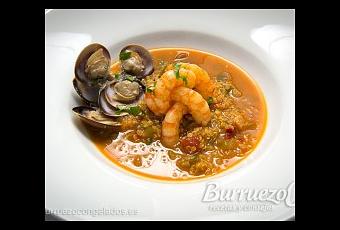 Freír los langostinos en una sartén aparte, con un poco de aceite y reservar. Abrir las almejas en esa misma sartén con unas gotas de agua y tapadas.