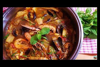 3.- Vertemos el vino y lo dejamos reducir. Ponemos el tomate triturado, la hoja de laurel, la sal y el pimentón. Rehogamos todo bien, bajamos el fuego y cocinamos 5 minutos más. Cubrimos todo con agua y cocinamos 20 o 25 minutos hasta que las papas estén tiernas. Añadimos los mariscos y cocinamos otros 10 minutos más. Apagamos el fuego, le añadimos una hojas de hierbabuena lavadas y picadas y lo dejamos reposar unos minutos.