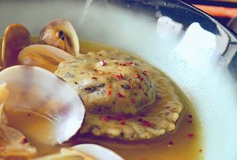 En un plato o bol servimos una ración de raviolis y unas cuantas almejas.