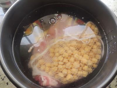 1- Todos los ingredientes son opcionales, que podéis poner a gustos. Escurrir los garbanzos (Yo los introduzco en una red en agua la noche anterior, lavar bien el pollo, y el resto de ingredientes, y poner todo en la cubeta, hueso jamón, yo uso el hueso de jamón que comemos en casa, así que lo meto en agua la noche antes para rasparlo bien, puerro, apio o cebolla, zanahoria pelada, cubro con agua hasta 3/5 de lo que marca la cubeta, una cta. sal, poner a cocer: