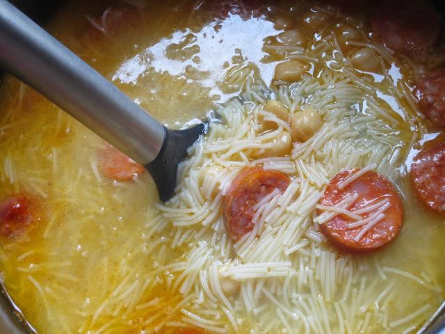 3- Yo hago sopita con el caldo, cuando está hirviendo, echo la pasta , (Se suele poner 100 gr. por litro de caldo) , con los garbanzos, y a mi hija y a mí nos encanta. Dos platos por muy poquito dinerillo! Sopa y croquetas de puchero.