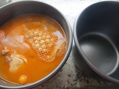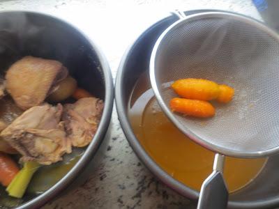 Y en otra cubeta de la olla, colamos el caldo, es muy práctico tener dos eh? Así, directa a la olla para hacer la sopita,jeje