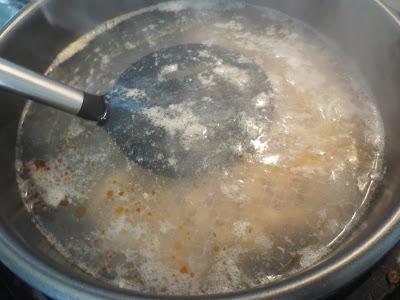 Cuando comience a hervir se retira la espumita que va saliendo con una espumadera, DESESPUMAR, quitar las impurezas. Ésto de desespumar es opcional, a mí me gusta más hacerlo siempre.