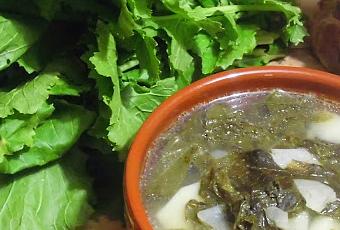 Pondremos otra olla al fuego con abundante agua y en ella echaremos las nabizas previamente cortadas en trozos pequeños, cuando levante nuevamente el hervor les daremos 15 minutos de cocción para eliminar gran cantidad de su clorofila. Pasado el tiempo de cocción de la carne la retiraremos para una bandeja y pasaremos las nabizas escurridas de la olla anterior a la olla con el caldo de carne.