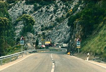 Corte total nocturno en el Desfiladero de la Hermida, Cantabria. Con motivo de los trabajos necesarios para la ejecución de la obra Rectificación de curvas de escasa anchura. Carretera N-621. Tramo: Desfiladero de la Hermida, que se está llevando a cabo. Se hace necesario colocar vigas para ejecutar tramos en voladizo. Para ello, se requiere el corte total nocturno de carretera para el transporte de dichas vigas desde el lugar de acopio y el izado mediante grúas a su posición definitiva.