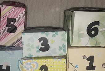 Este año decidí hacerle cajitas con tantos restos de cartulinas estampadas que tengo en casa. Les hago la cajita, les pongo el número, algo dentro y toca esconderla. Al volver del cole, al levantarse, o cuando se acuerdan... toca buscarla.