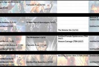 La semana pasada, Warner Bros. anunció un calendario de estrenos fílmicos de películas basadas en el Universo de DC Comics, además del adelanto del estreno de “Batman Vs. Superman: Dawn of Justice”. Por su parte, Disney/Marvel, Fox y Sony, también, entregaron las fechas de sus próximos lanzamientos.
