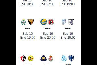 Local VisitaHora Vie 15 de Ene de 2016Veracruz---Leon19:30Santos---Chiapas FC21:30 Sab 16 de Ene de 2016Cruz Azul---Guadalajara17:00Tigres---Morelia19:00Dorados---Tijuana20:00Pachuca---Queretaro20:06Atlas---America20:30 Dom 17 de Ene de 2016UNAM---Toluca12:00Puebla---Monterrey17:00