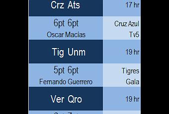 Viernes 18 de agosto de 2017Morelia vs Pachuca 19:00Tijuana vs Santos 21:00Sábado 19 de agosto de 2017Lobos BUAP vs America 17:00Cruz Azul vs Atlas 17:00Tigres vs UNAM 19:00Veracruz vs Queretaro 19:00Leon vs Monterrey 19:06Guadalajara vs Puebla 21:06Domingo 20 de agosto de 2017Toluca vs Necaxa 12:00
