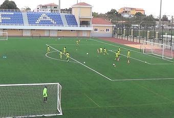 Trabajaremos en ambas porterías utilizando el campo de Fútbol 7 y la totalidad de la plantilla. Como siempre en este ejercico hemos utilizado a jugadores de nuestra Escuela de Fútbol Base AFA Angola.