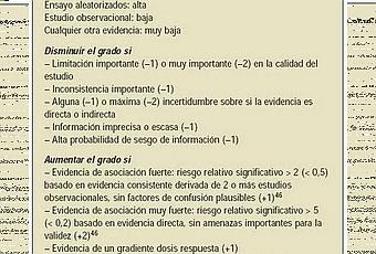 El siguiente cuadro, extraido de la Traducción Grade BMJ de Atención Primaria muestra los criterios que se siguen paea asinar los grados de evidencia.
