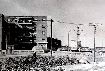 Vemos los bloques de la izquierda construidos por DUERO en 1972. Es el comienzo de la calle Málaga. A la derecha, y casi en terraplén, hoy en día se ubica el Parque de Leganés, construido en 1975 y ampliado entre los años 1982 y 1983.