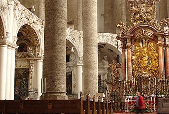 Luego de visitar la impresionante abadía de San Pedro (ver entrada anterior) bajamos hasta la calle FRANZISKANERGASSE desde donde se divisa las punteadas torres del FRANZISKANERKIRCHE que es sin dudas una de las iglesias más admirables y más viejas de Salzburgo. Algo ecléctica por tener una ornamentación que responde a una peculiar combinación de estilos que ha sido consecuencia de los añadidos que se ha hecho en su mobiliario y de su estructura desde el siglo XV, lo extraordinario en esta iglesia son las esbeltas 5 columnas que rodean al altar barroco. Lamentablemente las fotos que tomé dentro no salieron muy bien por lo que tuve que tomar prestada una imagen de una página web para dejar ver la belleza de los interiores. En realidad no hay iglesia en esta ciudad que no sea impresionante, parece que la religiosidad se vive con mucha devoción y hay un esmerado cuidado en la mantención de los edificios religiosos.