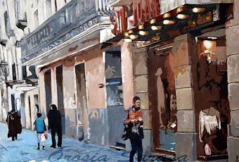 Una chaqueta de mil colores y una camiseta de verano. Una camiseta de verano en pleno invierno…antes no hubiese ocurrido ¿Antes de qué? Antes de que se fueran todos, antes de la mudanza. Antes del verano. Antes era ahora y ahora caminaba por calles azules para llenar el tiempo, para no perder el juicio, para dar sentido a su vida, para no quedarse parada como los parados. Andaba hasta derramarse exhausta en la silla de un bar donde tardaba horas en advertir la consistencia acuosa del café. Horas de silencio; roto acaso al darse de bruces con la mujer del sombrero de gabardina y la mirada perdida. Entonces, algo reconfortada por la conversación, un poco menos excluida por la soledad, encontraba fuerzas para reanudar su viaje y durante un tiempo recorría de nuevo las viejas calles de su nueva infancia. Calles sin recuerdos, ni nostalgias del otro lado del mundo; allá donde aun se enfría su cena, sobre una pobre mesa de hule escarlata.