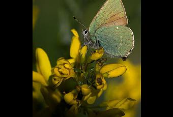 "Pequeño licénido distribuido por la mayor parte de Europa , el norte de África , Rusia , Asia Menor , Siberia , Amurland , Baluchistán y Chitral . Todavía está muy extendida en la mayor parte del Reino Unido, aunque muchas colonias se han perdido en los últimos años . Frecuenta coscojares, romillares y en general, zonas de vegetación arbustiva y abierta. Identificable por su color verde metálico. Se distingue del más escaso C. avis, por el cerco blanco alrededor de los ojos."