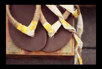 La primera imagen es de Kelly Hicks y consiste en forrar con cordón y tiras de tela las sujeciones de unas chanclas hasta convertirlas en sandalias romanas. En su página encontraréis más imágenes de su resultado (¡por aquí pensamos hacernos algo parecido utilizando trapillo!).