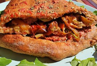 - Separamos la masa en 2 o 3 porciones, estiramos cada una con un rodillo sobre una superficie enharinada dándoles forma redonda de menos de 5 mm de grosor. Visualmente dividimos el círculo de la masa en dos partes y colocamos el relleno sobre una de ellas para luego poder taparlo y sellar los bordes. Primero untamos la salsa, colocamos las láminas de berenjena, el sofrito de cebolla y pimiento, el aguacate y el queso. Tapamos el relleno con la masa formando un bolsillo y enrollando bien los bordes. Se puede untar la salsa de tomate encima de la calzone y colocar más queso (mejor si es un queso que se derrite).