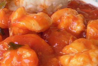 Incorporar al refrito la salsa de tomate y pimiento morrón, dejándolos hacer un minuto, agregando a continuación el vinagre, el kétchup, el vino blanco (si van a añadir tabasco, éste es el momento)y los langostinos; salar al gusto y dejar cocer a fuego lento unos diez minutos hasta conseguir la consistencia deseada.