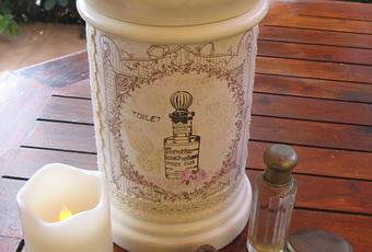 mirad qué requetebien le va este papel de decoupage que tenía guardado desde hace mucho tiempo.....El papel llevaba 4 dibujos de botes de perfumes diferentes. He utilizado 2....corté los cuadrados de estos dos y los adherí con cola disuelta en un poquito de agua. Extiendo la cola y dejo caer el papel, luego con un paño voy presionando del centro a los extremos pàra quitar las posibles burbujas que se hayan hecho