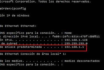 En la ventana negra que se abre escribimos el comando ipconfig y tras pulsar en Intro aparecerá en la respuesta nuestra puerta de enlace.