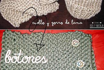 Superpuse los dos extremos y le cosí estos botones de madera. Ahora parece que el cuello está cruzado. Y no me queda grande.El gorro no lo tengo a mano, pero tengo reservado un botón para él.Cambio de look total.