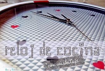 Como no, el cambio de look se lo he de agradecer al washi tape.Ahora más abajo veréis cómo era el reloj. Ese típico reloj, que está en la cocina, y que no tenía ni pila ni nada. Y que es más feo que feo.Aunque ahora sí que no pega nada con la cocina (que es antigua), se ve más vistoso y útil, porque ahora, al menos se usa.Los materiales usados son varios: tres modelos de washi tape, destornillador, papel de pegatina, troqueladora, cúter y spray blanco.Previamente, antes de nada, limpié bien el reloj. Estructura y cristal.Una vez limpio, lo desmonté. Si algo he aprendido del manitas de mi padre, es que no necesito un destornillador para desatornillar un tornillo. El caso es que en esta casa tengo cero herramientas. Busqué por los cajones de la cocina y cogí un cuchillo, y el abridor de botellas de vino. Probé con el primero, y nada. Así que, saqué la mini navajilla del abridor, y oye, en un minuto tenía fuera los cuatro tornillitos.Quité el embellecedor y el cristal, y el resto del reloj se quedó en una pieza. No vi la forma de quitar la caja trasera y las manillas, así que tuve que tunear la parte frontal que era cartón) con las manillas. Pero bueno, no fue tan complicado.