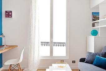 Mini cocina de Ikea con tabla de madera que se prolonga para doble uso , como mesa de comedor ,zona de trabajo.... Por supuesto sofá cama enmarcado en mueble armario -estantería...todo en uno , pero con mucho gusto!