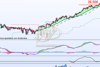 Pero en este caso no ha llegado la sangre al río, y dos semanas después de confirmarse la divergencia bajista ésta se rompió y el precio no solo continuó con la subida si no que lo hizo a lo grande. Dibujó una gran vela alcista ala que únicamente le faltaba el volumen haciendo que la fortaleza del valor incrementara, pero debido al distanciamiento que provocó a la mm de 30 sesiones era necesario un recorte como el que está realizando en estos momentos.