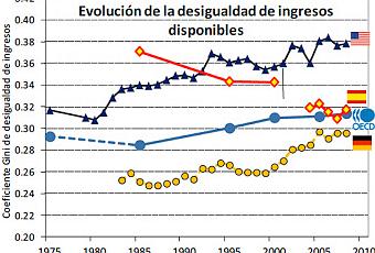 Los mercados son una fuerza descomunal capaz de implosionar el sistema. Y probablemente al final tendrán razón quienes escribieron que al monstruo lo matarían las contradicciones internas; la cuestión es esperar, ¿a saber cuándo? Y quizás los mayores y mucha otra gente no queramos esperar al paraíso que supuestamente nos acogerá allá en el cielo, o la revolución, quizás haya que intentar resolver nuestros problemas aquí en la tierra, en nuestras vidas. Y si viene la revolución que nos pille trabajando en esto de evitar que nos destrocen las condiciones de vida que previamente habíamos logrado, respecto al trabajo-paro, pensiones, sanidad y educación… La paradoja para algunos que dicen hoy lo mismo que ayer y que hace 40 años y… es que estamos cayendo, sin que nunca hubiéramos subido, pero, es imposible retroceder si previamente no habíamos avanzado, es imposible que nos quiten cosas, si antes no las conseguimos. Son los cambios. PD1: El crecimiento de las curvas muestra crecimiento de la desigualdad, su caída muestra mayor igualdad, el de arriba crece en EEUU y Alemania, mucho antes que en España y conjunto de la OCDE. PD2: El otro chart muestra el mismo salvaje incremento de la desigualdad en EEUU, muy inferior al producido en España y Francia y bastantes años antes. PD3: El último chart son las ganancias de capital K gains, aproximadamente desde mediados de los noventa hasta su pico de la crisis, a pesar de la cual siguen conservando la mayoría y se llevan la mayor parte, respecto a salarios, wages, el blanco de abajo, en la composición del grupo de privilegio español.