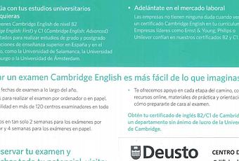 Cambridge English Language Assessment estará el día 8 de marzo en el hall de entrada del Edificio Centenario del campus de Bilbao para realizar una campaña informativa sobre los exámenes de inglés. Así mismo, las primeras personas que se matriculen para la siguiente convocatoria, recibirán un pequeño obsequio.