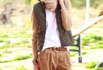 Para ir un poco con los tonos de las zapatillas elegí el resto del outfit en camel y verde, la chaqueta de lana llevaba guardada varias temporadas (tendrá 8 ó 9 años) porque es de estas cortitas pero con el chaleco he visto la manera de seguir usándola.