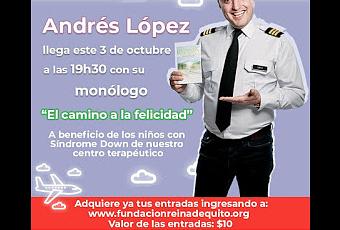 Este próximo 3 de octubre, todo el Ecuador disfrutará de un show sin precedentes a cargo del reconocido comediante internacional Andrés López, que deleitará las pantallas con su monologo “El camino a la felicidad” de forma virtual a las 19h30, en beneficio de los niños con Síndrome de Down del Centro Terapéutico de la Fundación Reina de Quito.