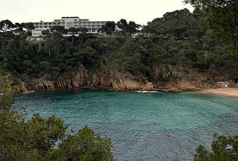 El siguiente tramo del Camino de Ronda que nosotros abordamos es el que va de Aiguablava a Fornells y que comienza con unas escaleras que hay en la propia playa. Aquel día la marea estaba alta y nos las tuvimos que ingeniar para no mojarnos los pies. Desde lo alto, el Parador de Aiguablava nos vigilaba.