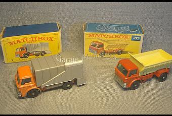 Los dos camiones Ford, de la escala chica, de los Matchbox de mi infancia, que conservo con sus respectivas cajas de cartón originales, son un camión recolector de basura y otro con caja en forma de tolva, con descarga en la parte inferior.